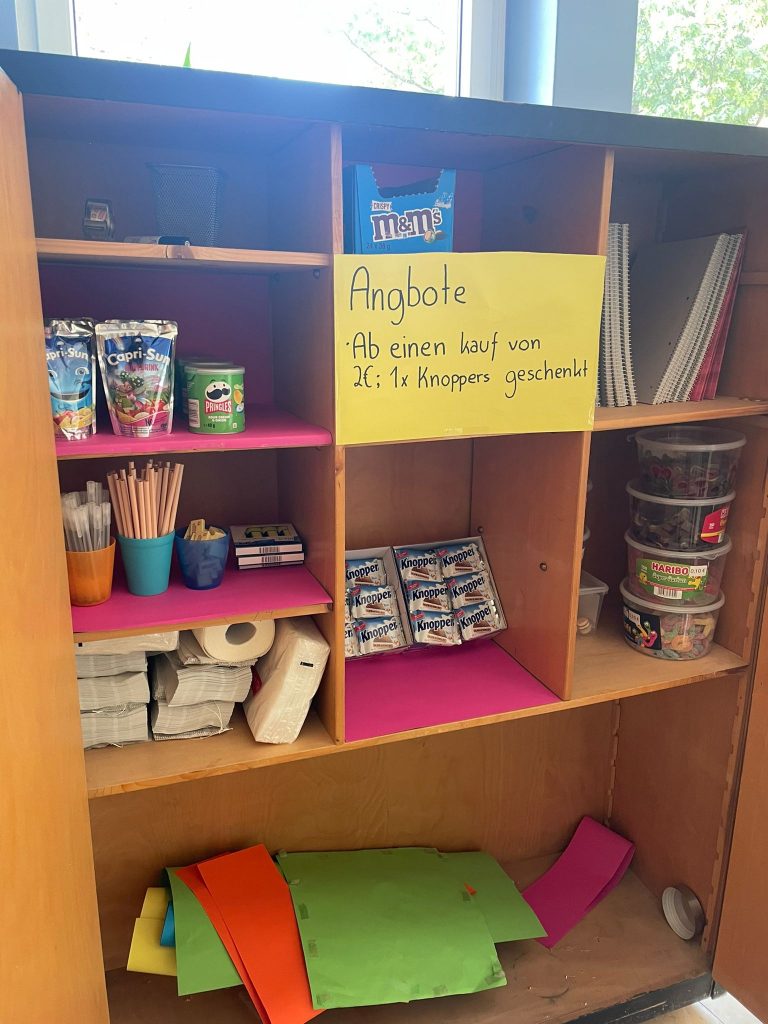 Unser Schulkiosk ist das Herzstück der MaxGeno: Hier versorgen wir die Schulgemeinschaft mit Schreibwaren und kleinen Süßigkeiten. Ein zweites Standbein sind unsere Plotterarbeiten – von individuell gestalteten Taschen und Einkaufsbeuteln bis hin zu Team-T-Shirts und Geschenkbeuteln für besondere Anlässe.
