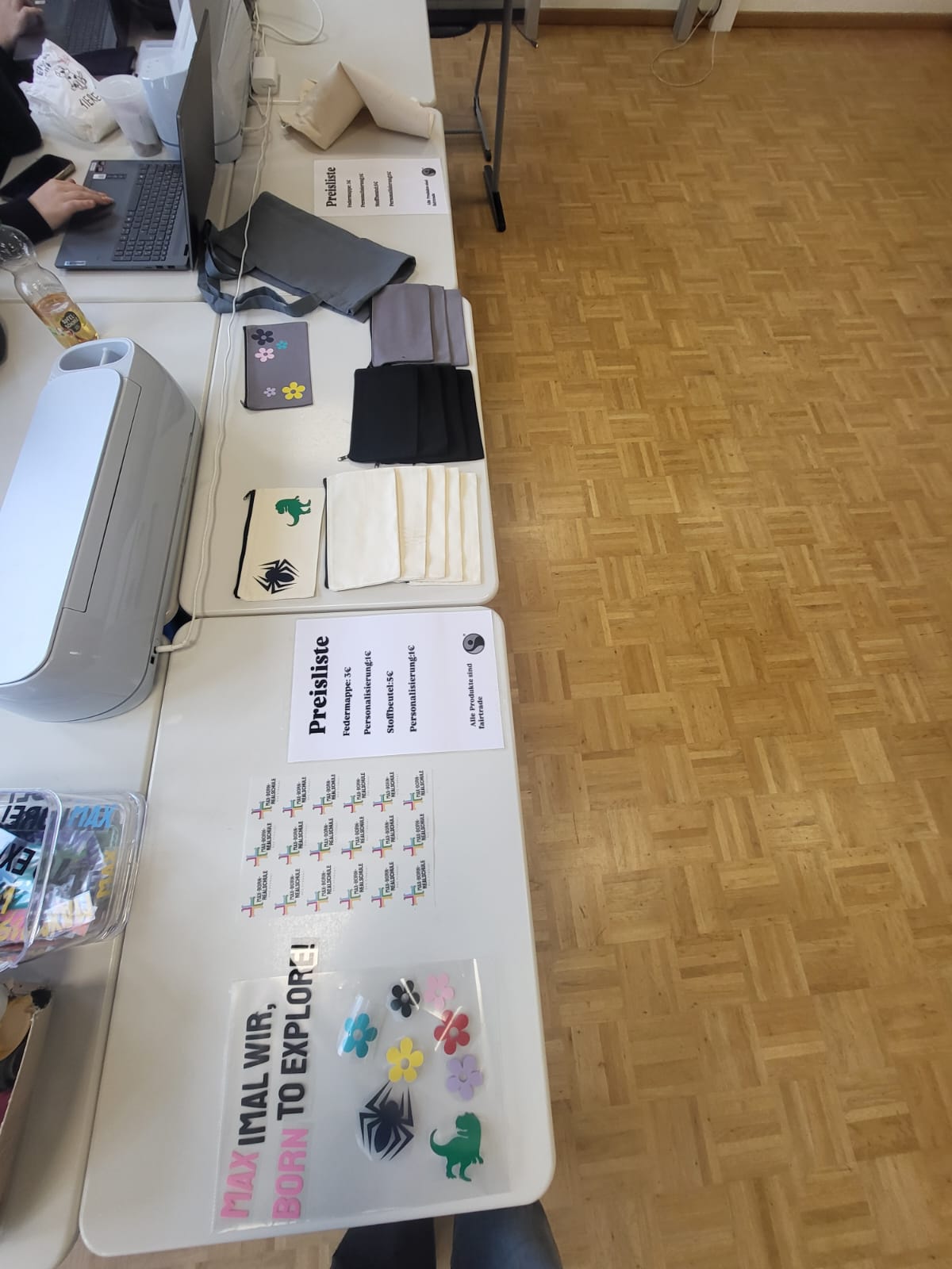 Unser Schulkiosk ist das Herzstück der MaxGeno: Hier versorgen wir die Schulgemeinschaft mit Schreibwaren und kleinen Süßigkeiten. Ein zweites Standbein sind unsere Plotterarbeiten – von individuell gestalteten Taschen und Einkaufsbeuteln bis hin zu Team-T-Shirts und Geschenkbeuteln für besondere Anlässe.