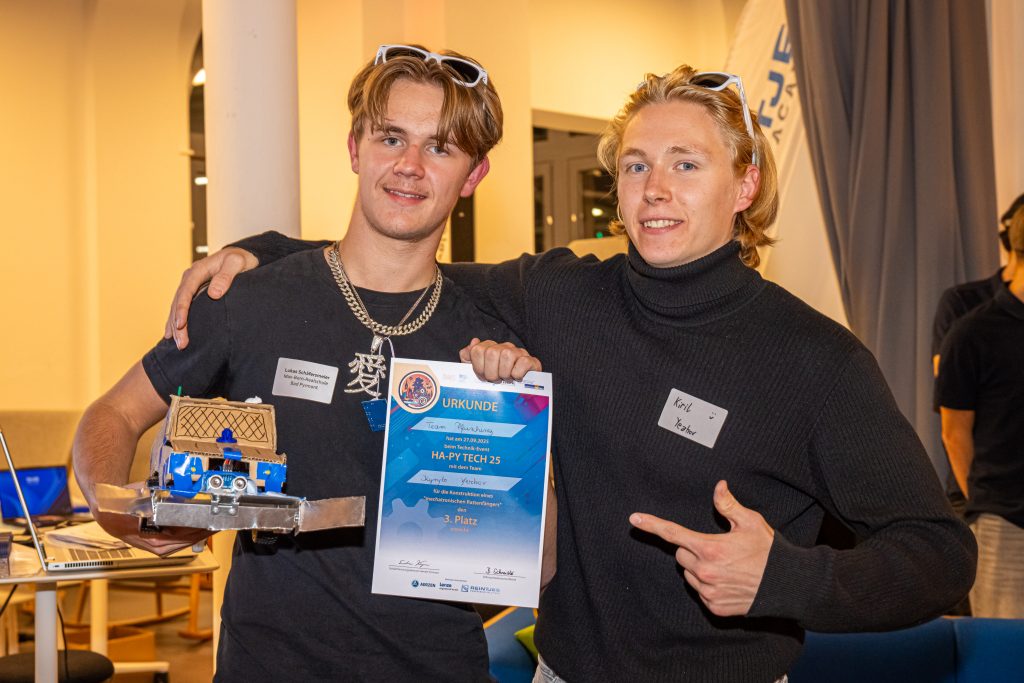 Hameln, 29. September 2025 – Die am Samstag, den 27. September zum ersten Mal bei zedita im historischen Kaisersaal des Hamelner Bahnhofs durchgeführte Technik-Challenge „Ha-Py Tech 25“ hat gezeigt, wie kreativ und technikaffin Jugendliche aus dem Weserbergland sein können: Sieben Teams mit insgesamt 24 Schülerinnen und Schülern von zehn Schulen erweckten die weltberühmte Rattenfänger-Sage zu neuem Leben und entwickelten in nur zehn Stunden ihre eigenen Versionen eines „Mechatronischen Rattenfängers“. Deren Aussehen erinnerte jedoch weniger an die bekannten Bilder der Sagengestalt. Ausgestattet mit zwei Getriebemotoren samt Rädern, Ultraschallsensoren, einer 9V-Batterie als Stromversorgung und selbstentworfenen, schaufelartigen Fangeinrichtungen vereinten die kleinen Hightech-Konstruktionen neben den elektronischen Elementen, die per Arduino-Mikrocontroller angesteuert wurden, auch mechanische Bauteile, die an entsprechenden Werkbänken von den Jugendlichen selbstständig hergestellt wurden.